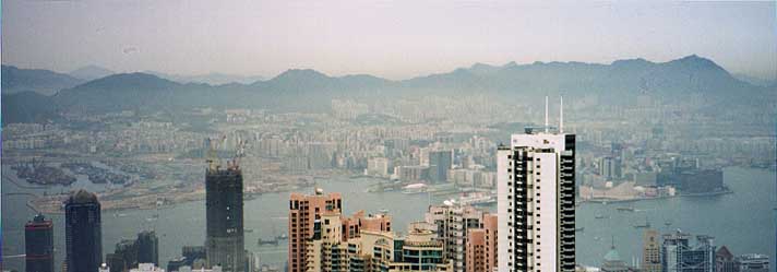 | ↑この感じ!!香港の街って感じです 中環〜ピークトラム駅 ↑ ピークトラム山頂駅 ピークトラムはこの新しいのがかっこいいですね。 はじめて来た頃はもっとボロかった。(85年頃の話です) ピークタワーも今と違ってました。 円筒形の建物だったと思います。 ↓ピークタワーからの眺め 白いビルの横が ちょうど九龍の太空館周辺です このときはまだ、啓徳空港でしたから九龍半島の西側が今とちょっと違います。 |