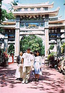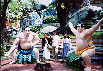 もう少し東へ戻ると ご存じタイガーバームガーデン 今は ハウパービラ といいます。 最近は訪れる人が結構少なくなったようですが でも、いつも人でいっぱいです。 傾斜地を利用してできていますので結構体力いります。 中腹でご休憩をどうぞ 椰子の実に入ったココナツジュースが あまり甘くなくておすすめです。 |