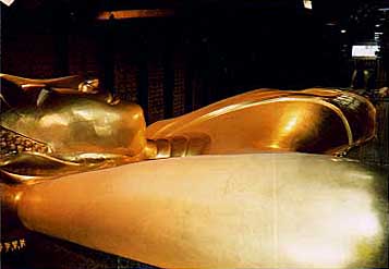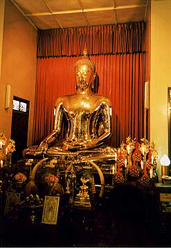 | → こちらは黄金の仏様 ワット・トライミット 何でも、盗賊から守るために漆喰で塗り固めた 醜い仏像だったそうです。 市内の廃寺に長い間放置されていて 「かわいそう」 ということで運ぼうとしたら すっごく重くって 運びきれず、雨ざらしに そしたら漆喰が雨ではげて金ぴかの仏様が出てきた・・・ |