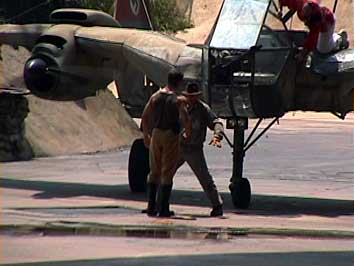 | ドイツの軍用機の前で ぼかすか 殴り合う場面 |