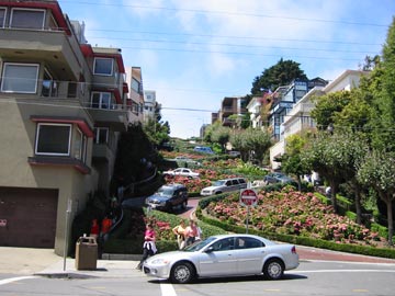 | 有名なロンバードの坂道です 坂の上がケーブルカーの駅になっています。 ここでおりて、ロンバードを下り、左に曲がったら フィッシャーマンズワーフまで、下り坂を10分ですね。 Lombard Street |